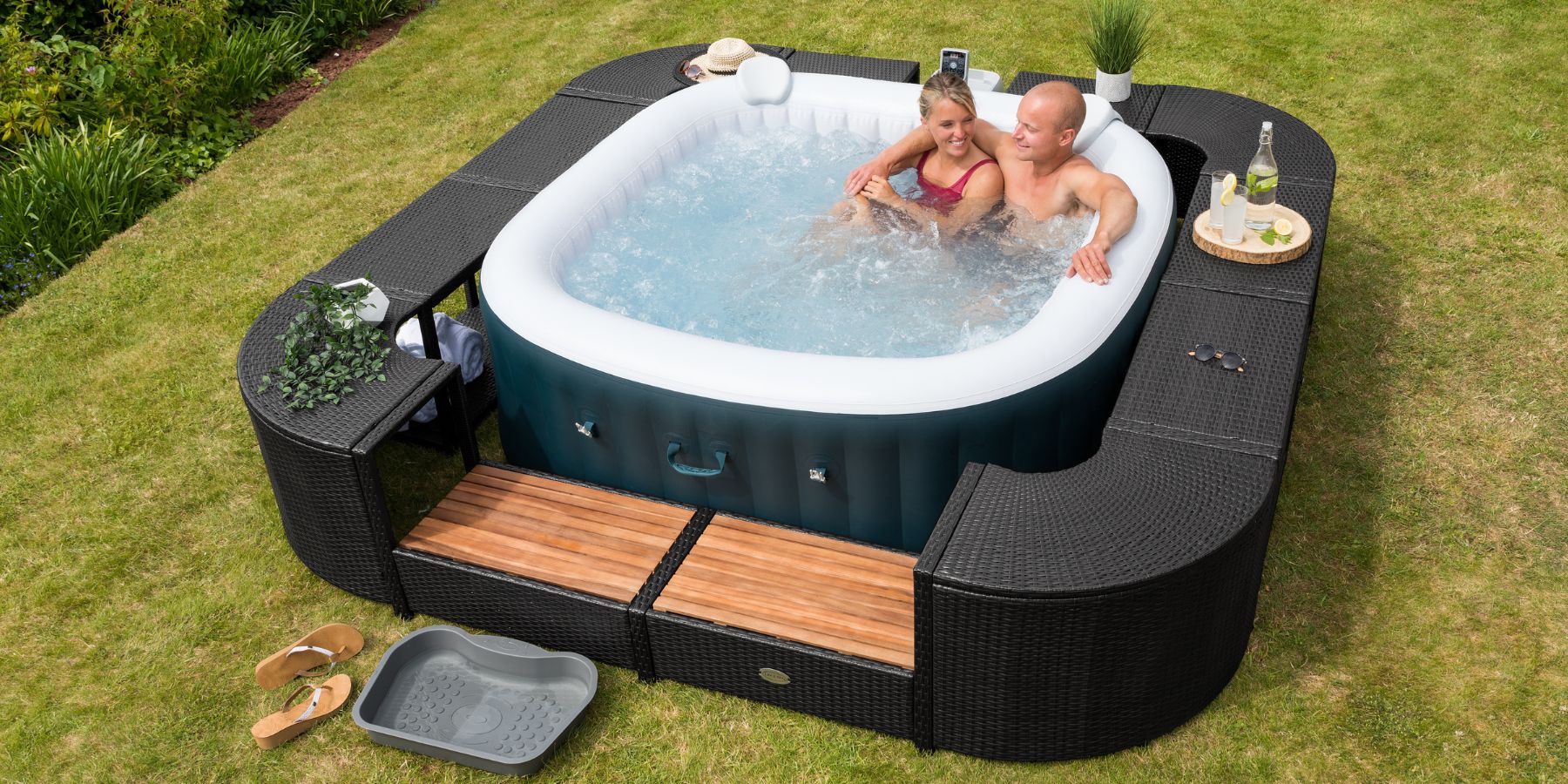 - Featuring built in storage, Acacia wood steps, and a designated pump cutout, this durable, weatherproof rattan surround offers convenience and elegance. Its sturdy galvanized steel frame ensures long lasting use, while the sleek design keeps essentials organised.