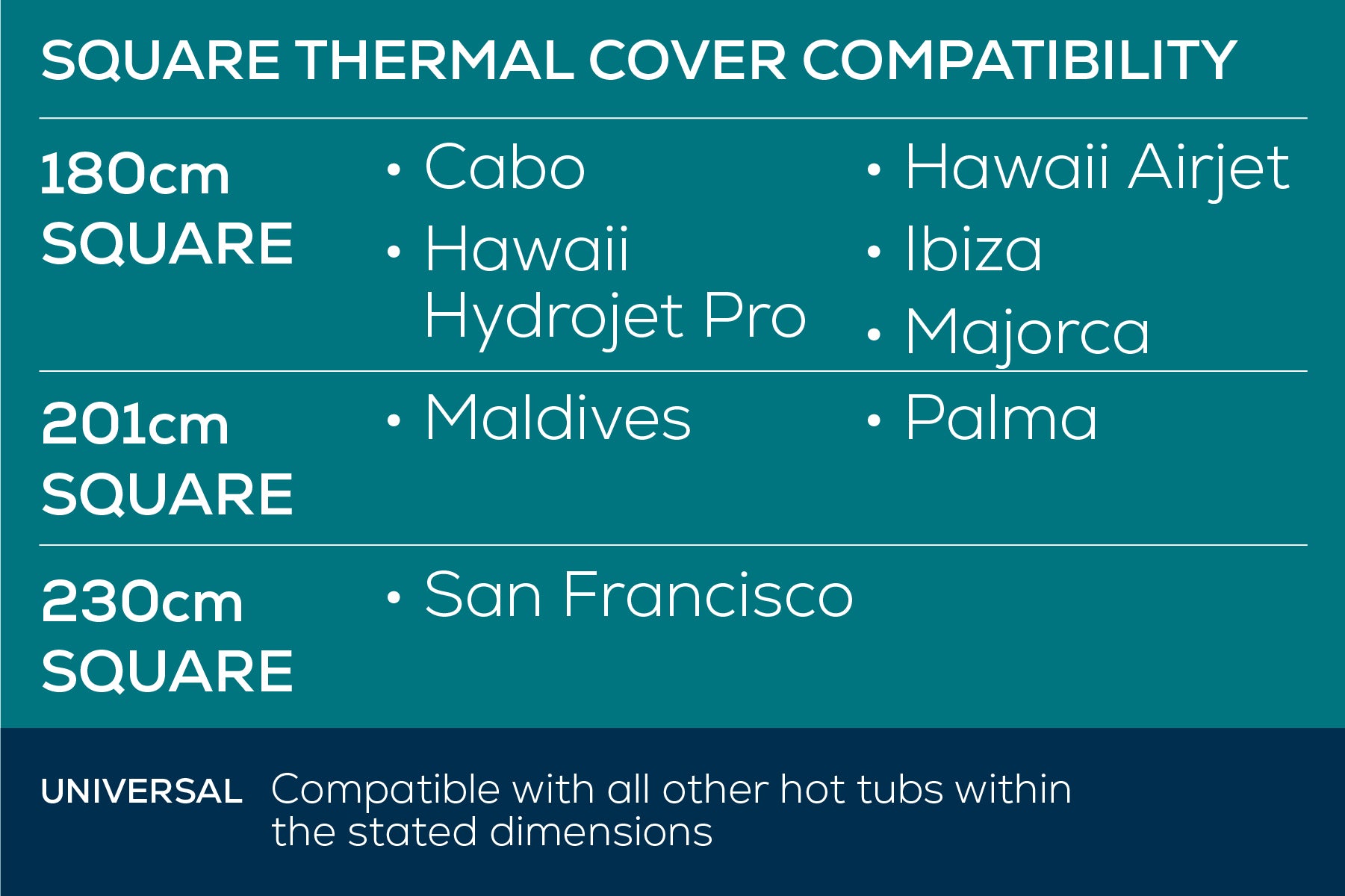 The Universal Thermal Hot Tub Cover is compatible with square hot tubs up to 201cm x 201cm x 85cm (79" x 79" x 33") including the following Lay‑Z‑Spa hot tubs: